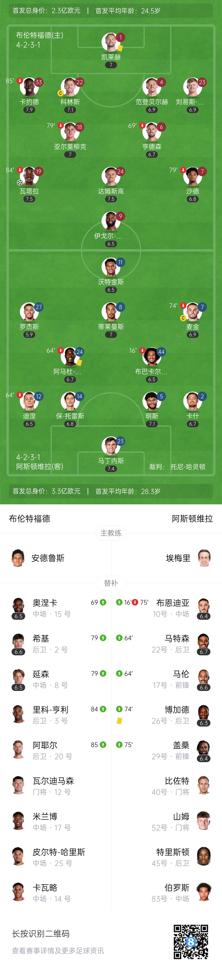 下半场补时5分钟,最终布伦特福德主场1-0战胜阿斯顿维拉,取得赛季首胜。