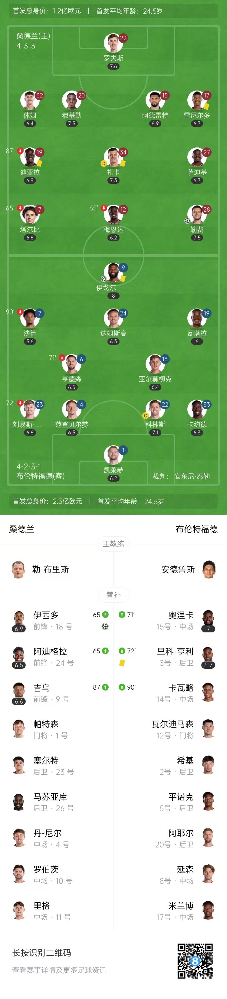 第96分钟,扎卡左路迎球直接送出传中,伊西奇头球破门完成绝杀,桑德拉2-1布伦特福德。↓