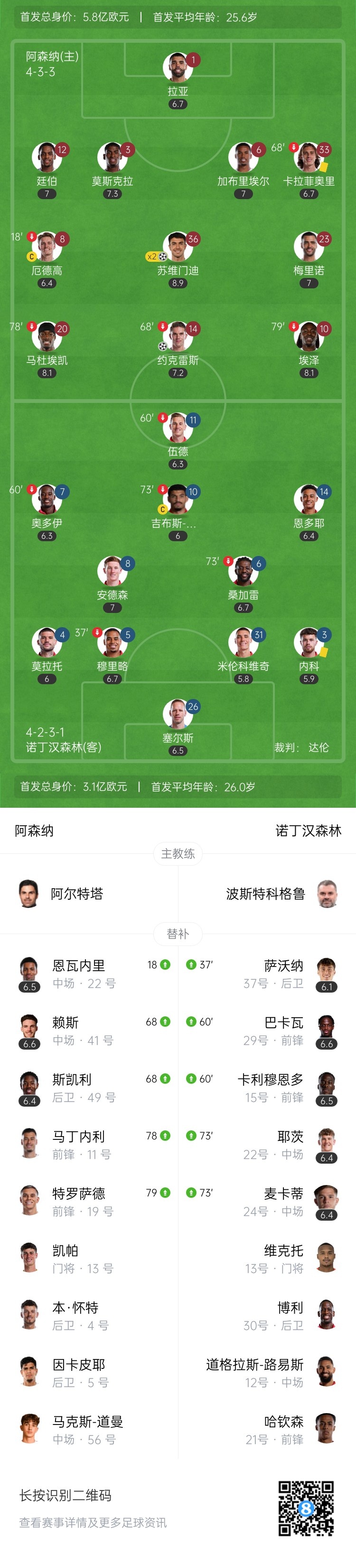 第79分钟,阿森纳前场定位球机会,赖斯接球后再传,特罗萨德得球斜传禁区,苏维门迪头球攻门得手,阿森纳3-0诺丁汉森林。↓