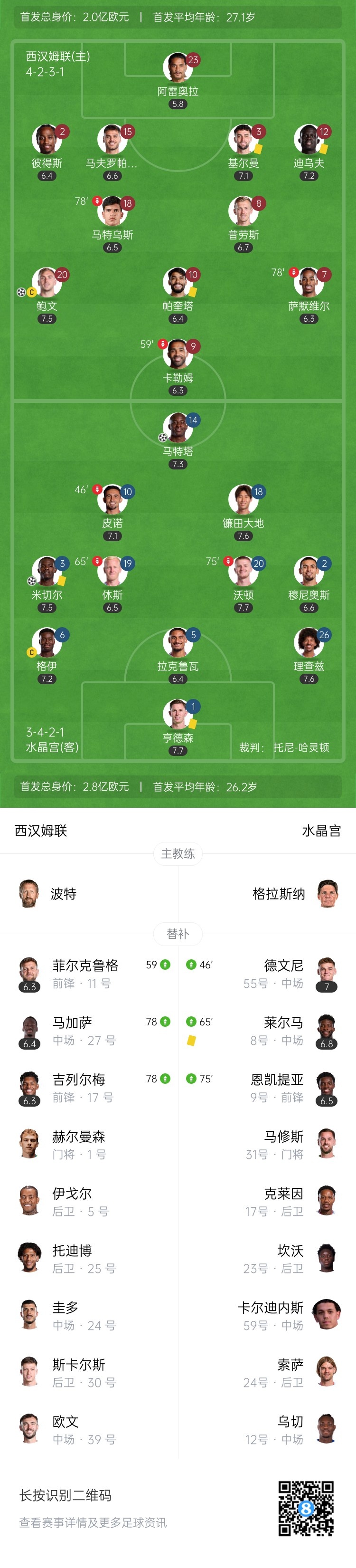 开局仍不败!水晶宫2-1西汉姆 米切尔凌空爆射制胜 西汉姆5轮4负