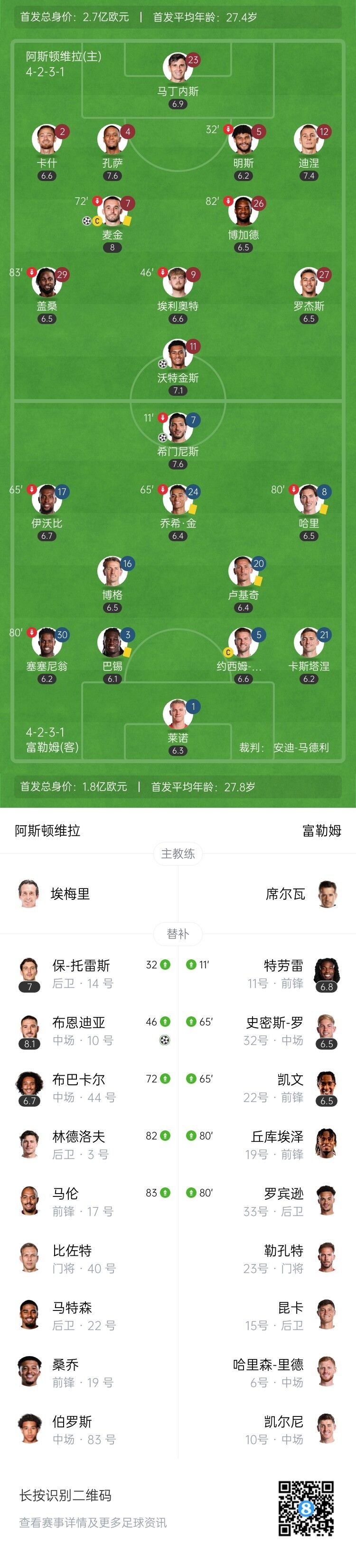 伤停补时6分钟。全场比赛结束,阿斯顿维拉3-1富勒姆。
