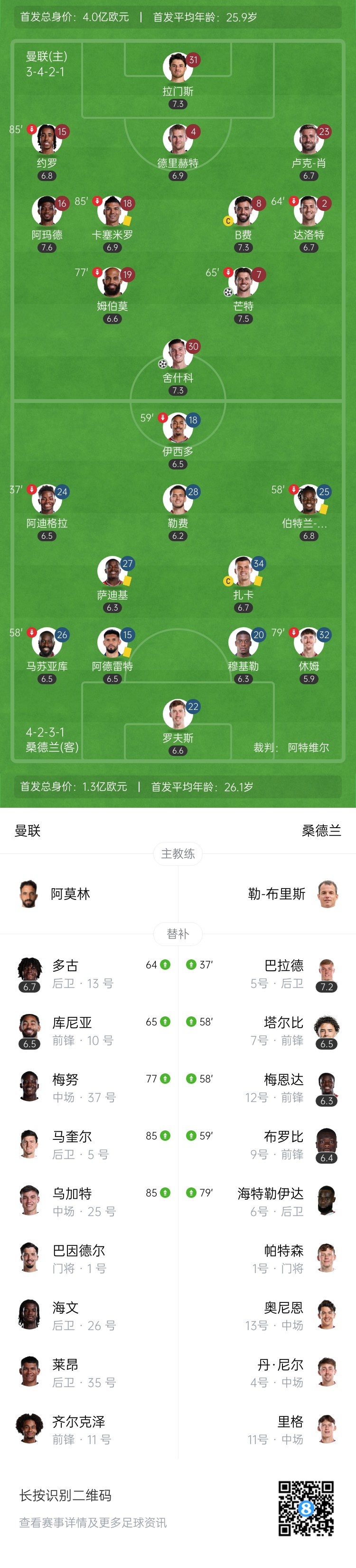 10月4日讯 北京时间10月4日22:00,2025-26赛季英超联赛第7轮,曼联坐镇老特拉福德球场迎战桑德兰,拉门斯迎来首秀。上半场姆伯莫助攻芒特破门,B费中框,阿玛德头球补射空门顶偏了,舍什科再下一城,曼联暂2-0桑德兰;下半场两队都没能再改写比分,最终曼联2-0桑德兰,迎来赛季第三胜,积分来到10分。