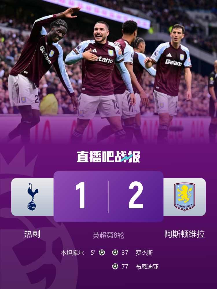 4轮1胜!热刺1-2遭维拉逆转 罗杰斯+布恩迪亚双双世界波维拉3连胜