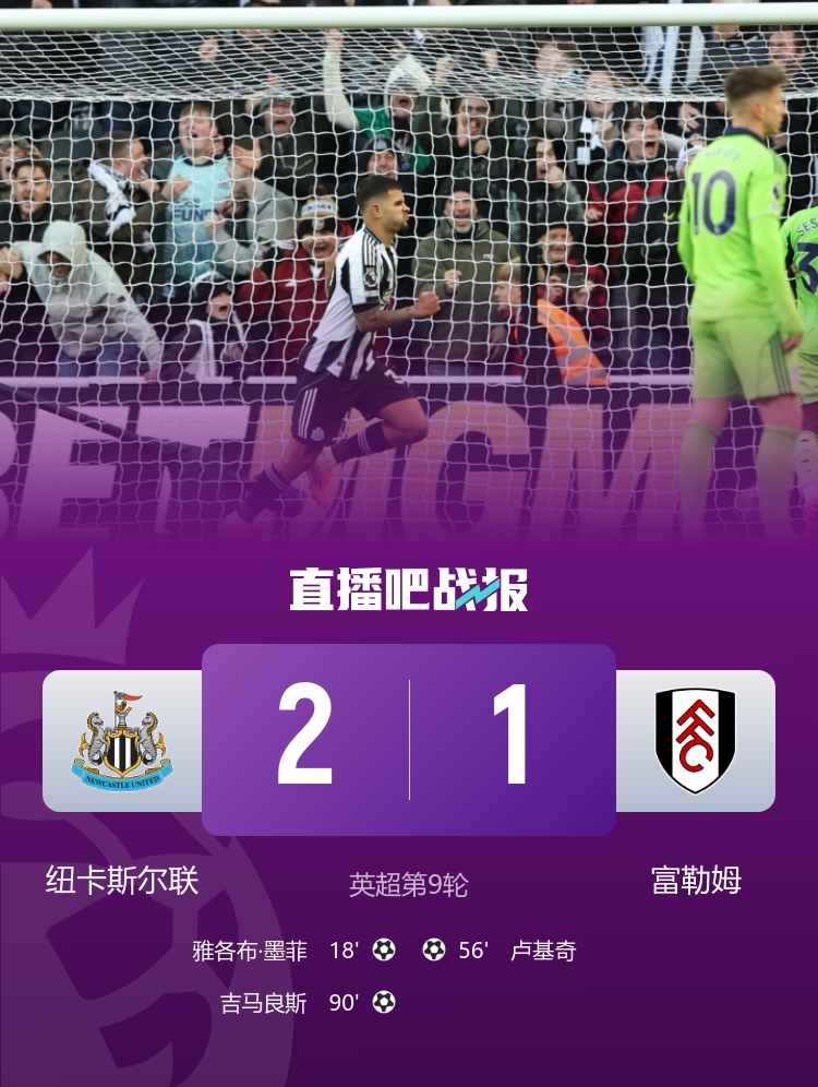 10月25日讯 北京时间10月25日22:00,英超联赛第9轮纽卡迎战富勒姆的比赛在圣詹姆斯公园球场进行,上半场沃尔特马德开场中柱,墨菲单刀破门+中柱随后失大单刀,下半场卢基奇头球补射扳平,吉马良斯推射绝杀,最终纽卡2-1富勒姆。