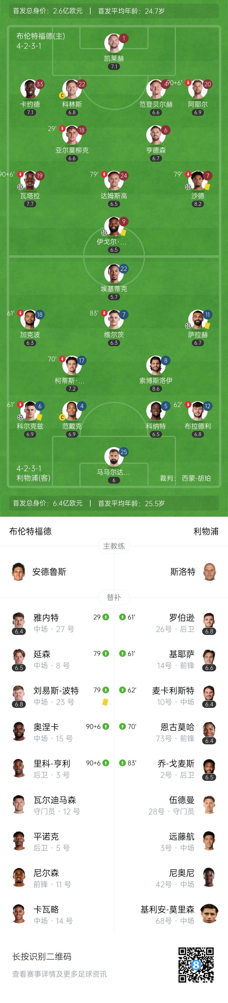 联赛4连败!利物浦2-3布伦特福德跌至第6 范戴克送点萨拉赫破门