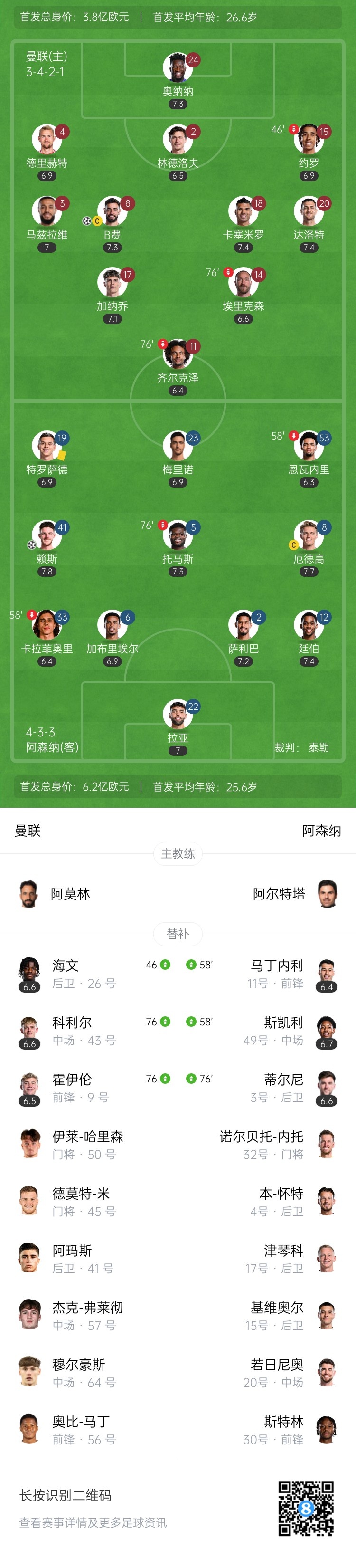 上半场伤停补时4分钟,特罗萨德背后铲倒加纳乔,吃到黄牌,也给了曼联很好的前场任意球机会。↓