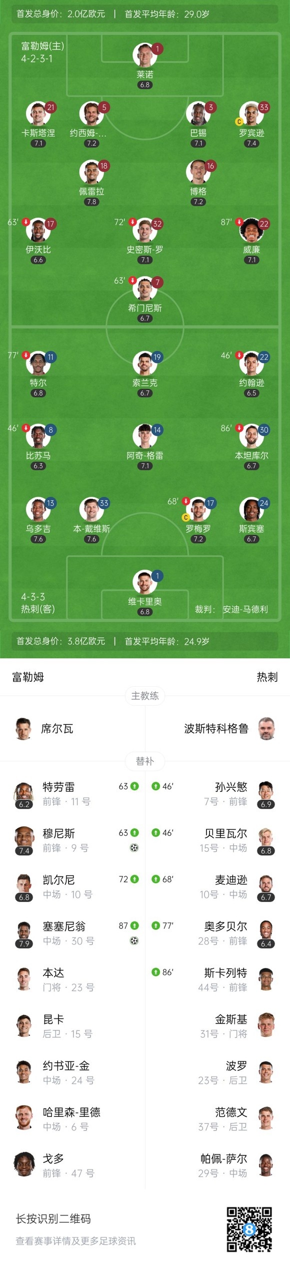 第77分钟,富勒姆打破僵局!热刺禁区解围不远佩雷拉横传点球点附近穆尼斯跟进低射破门,富勒姆1-0热刺。↓