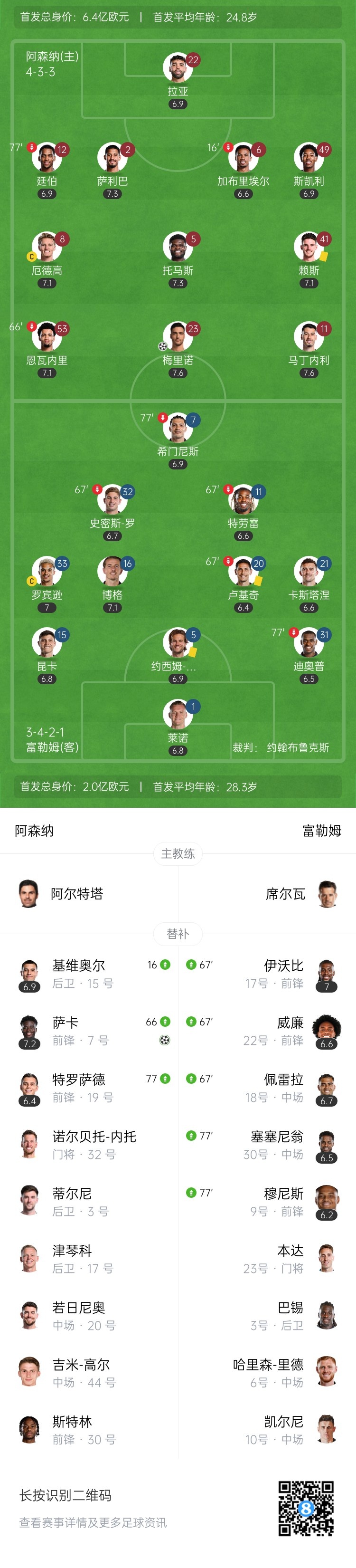 第90+4分钟,富勒姆反击,塞塞尼翁右路推进后横传门前,穆尼斯跟进抢点破门,富勒姆1-2阿森纳。↓