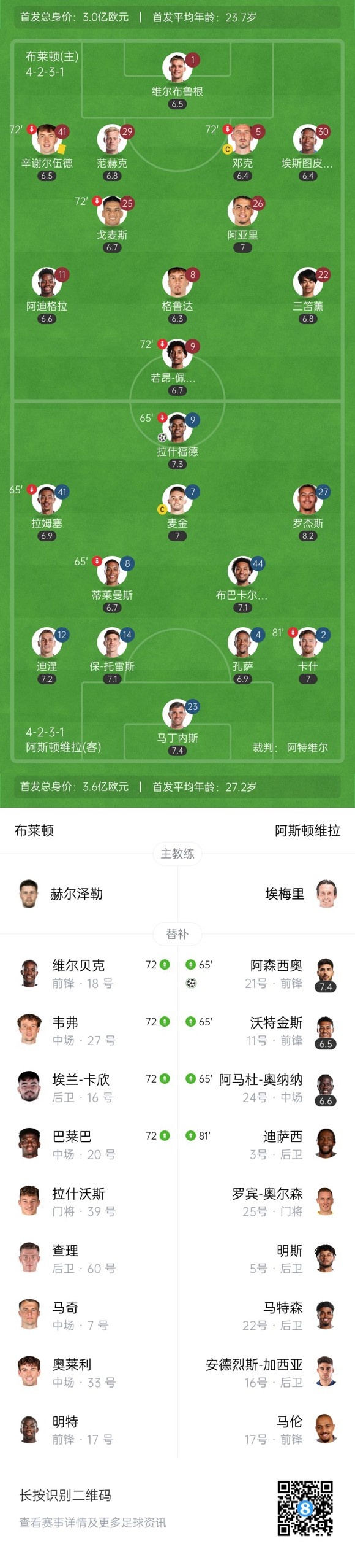 第78分钟,维拉扩大比分!反击机会罗杰斯右路下底倒三角阿森西奥跟上推射破门,布莱顿0-2维拉。↓