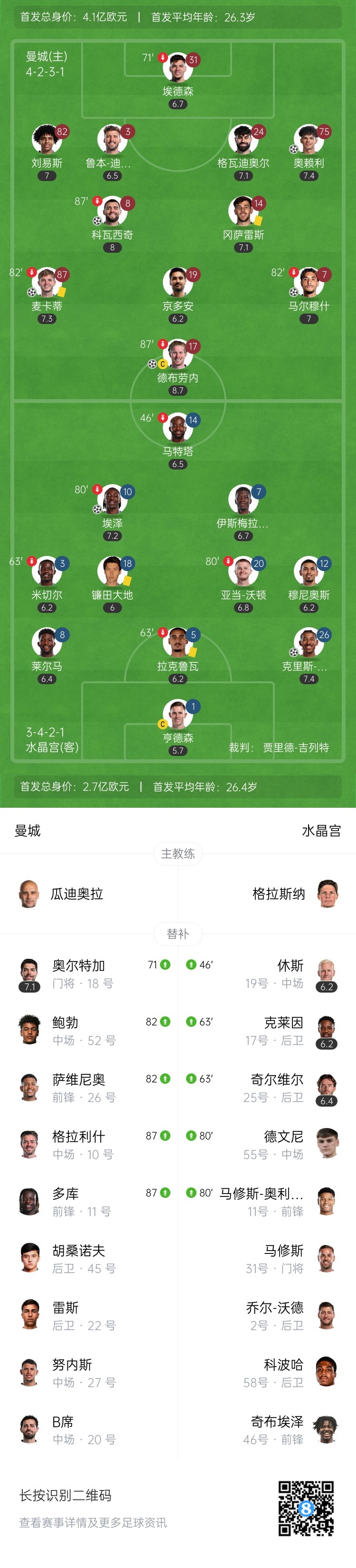 下半场伤停补时7分钟,全场比赛结束,最终曼城5-2水晶宫。