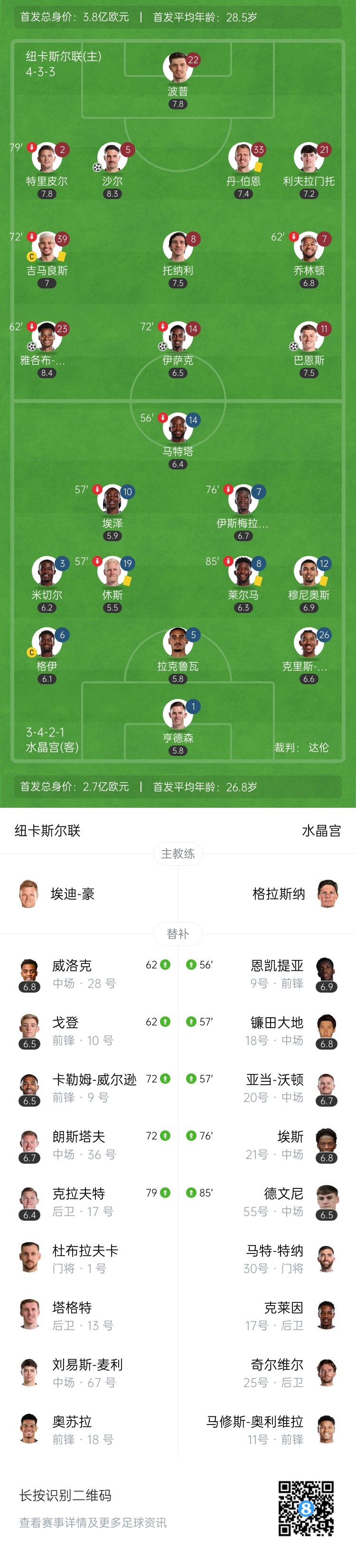 各赛事6连胜!纽卡5-0大胜水晶宫升至英超第3 纽卡近3场狂轰12球