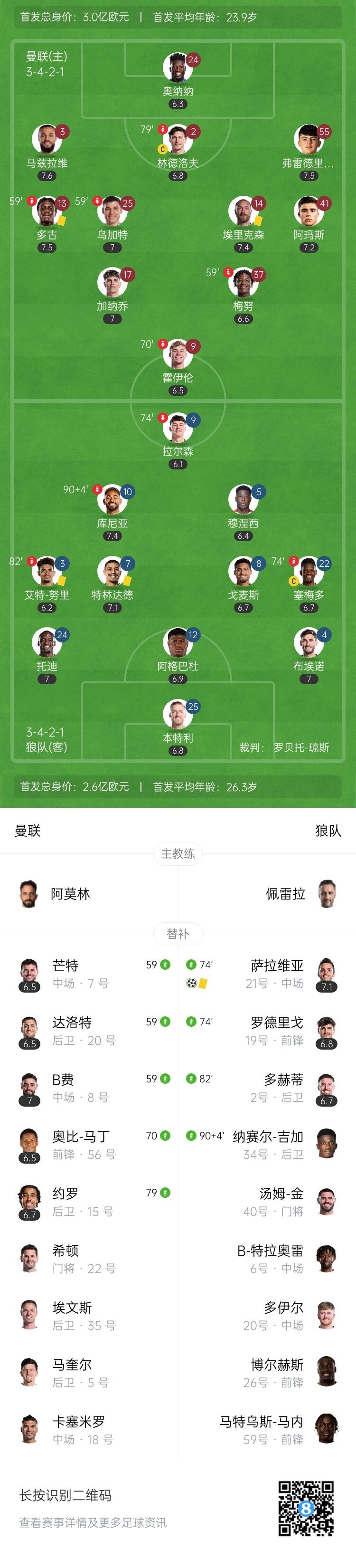 伤停补时1分钟。全场比赛结束,曼联0-1狼队。