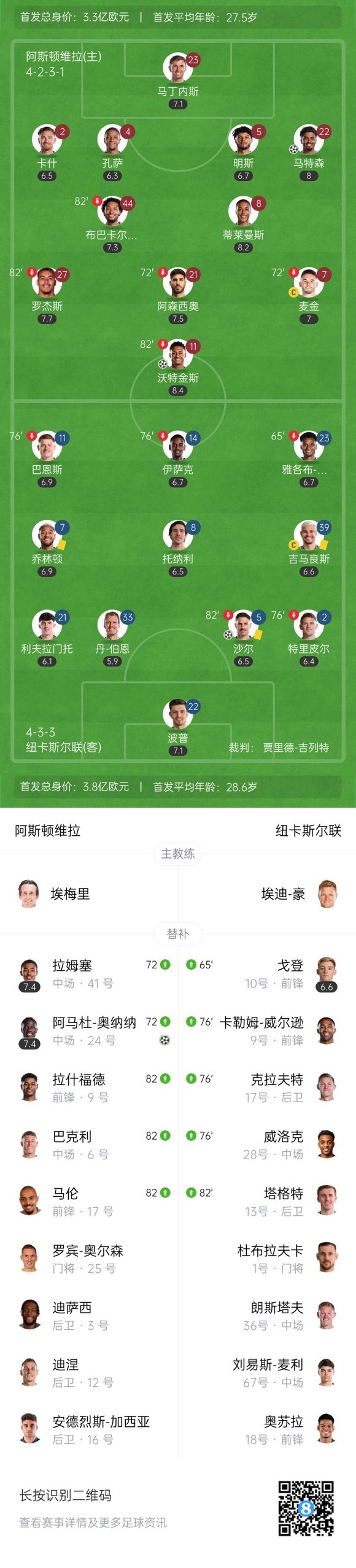 第74分钟,维拉锁定胜局!罗杰斯禁区回做弧顶奥纳纳远射破门,维拉4-1纽卡。↓
