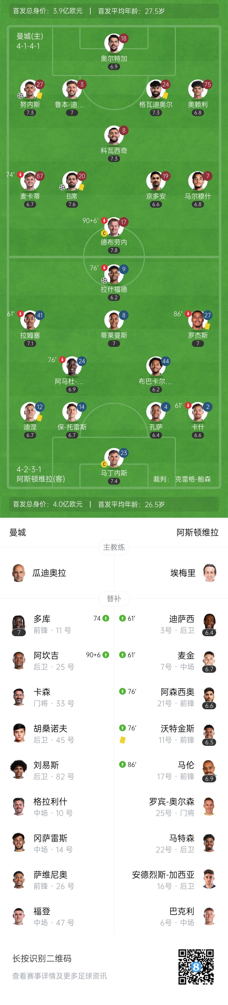 4月23日讯 北京时间3:00,英超第34轮曼城vs阿斯顿维拉,比赛在伊蒂哈德球场打响!上半场,拉什福德开场中柱,随后B席破门;迪亚斯送点,拉什福德点射扳平。下半场,马尔穆什破门但越位无效;多库94分钟助攻努内斯绝杀!最终,曼城2-1战胜维拉,终结维拉英超5连胜!排名暂升英超第3。