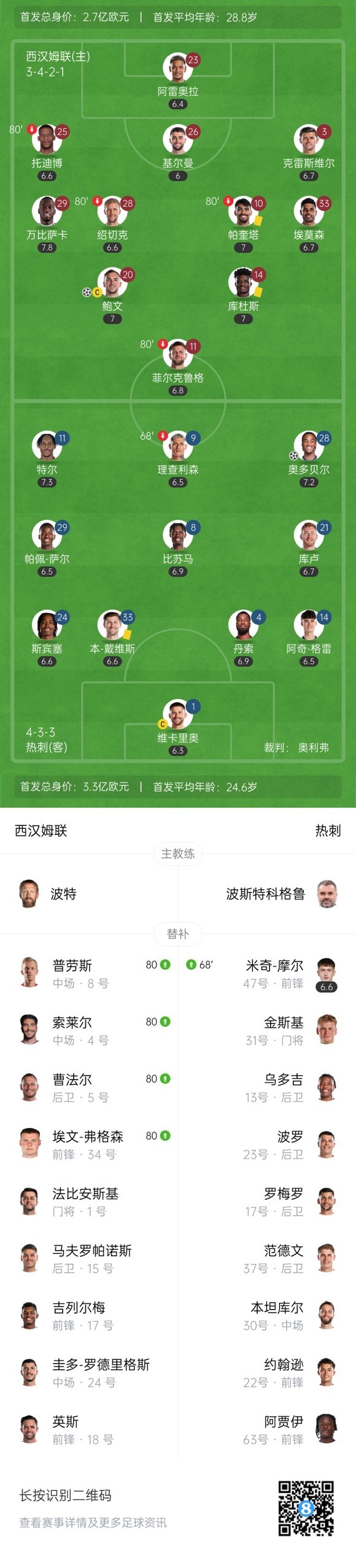 下半场补时4分钟,第93分钟,西汉姆左路弧顶定位球机会,普劳斯直接打门稍稍偏出。↓