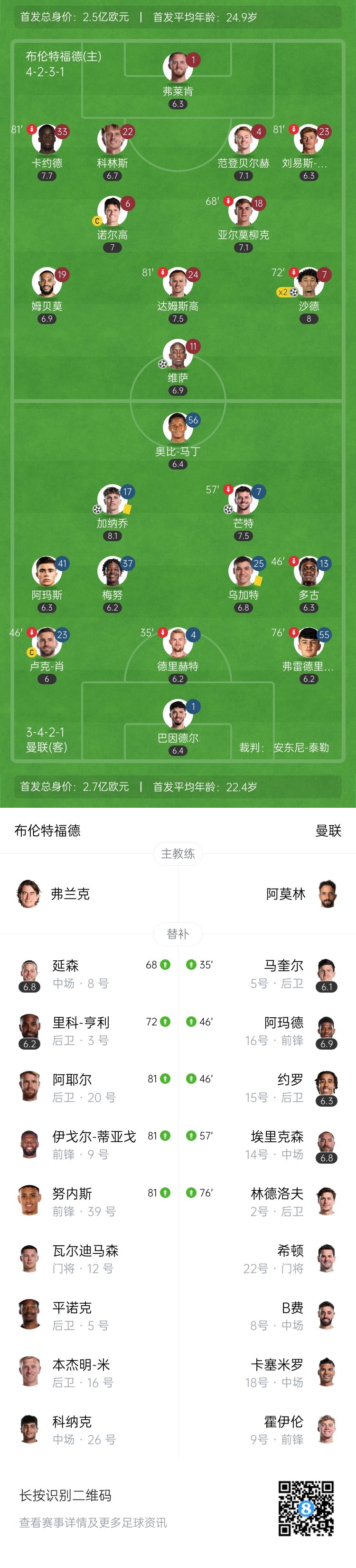 下半场伤停补时7分钟,全场比赛结束,最终曼联3-4布伦特福德。