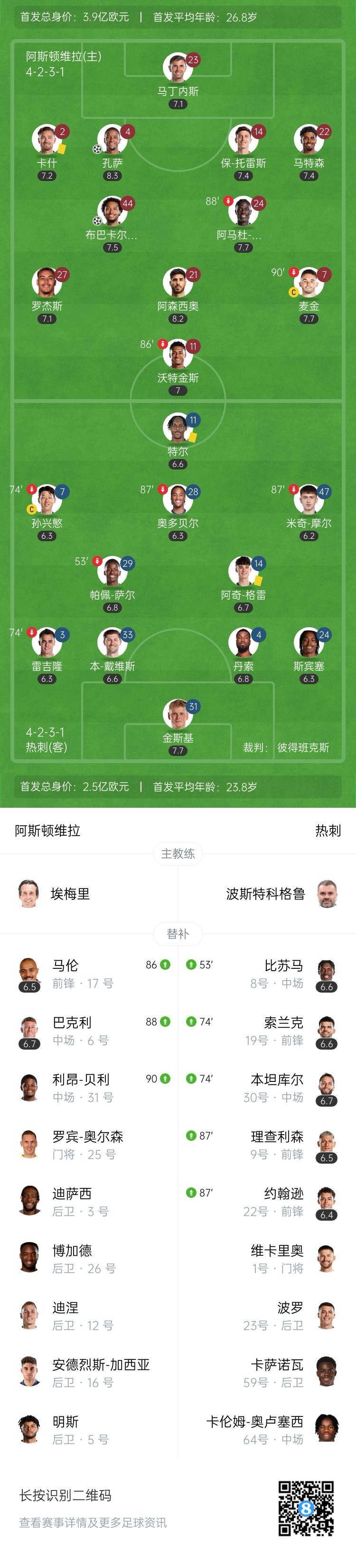 全场比赛结束,热刺0-2维拉。