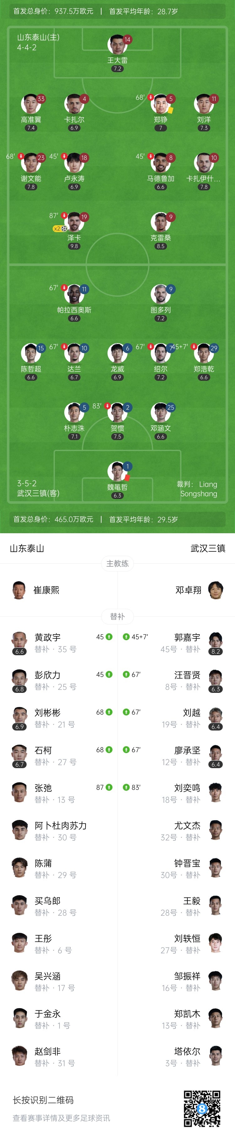 狂轰35脚!泰山3-1十人三镇 泽卡双响刘彬彬破门 两队合计7次中框