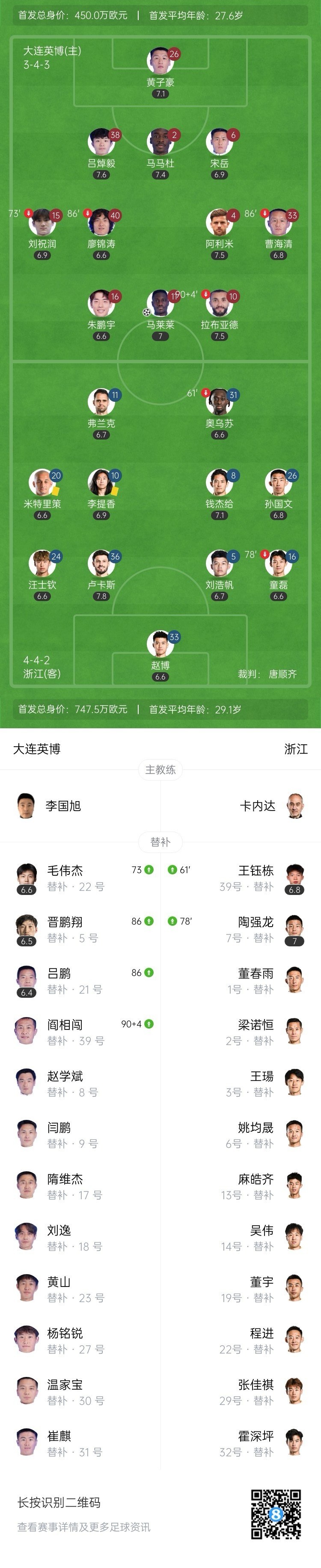 6月30日讯 北京时间6月30日19:35,中超第16轮,大连英博在主场大连梭鱼湾足球场迎战浙江队。上半场,大连英博多次威胁到赵博把守的球门,拉布亚德助攻马莱莱头球破门,卢卡斯补时破门被吹越位;下半场,王钰栋替补登场,双方均未破门。最终,大连英博1-0战胜浙江队,浙江队和英博同积20分,分列第9和第10位。
