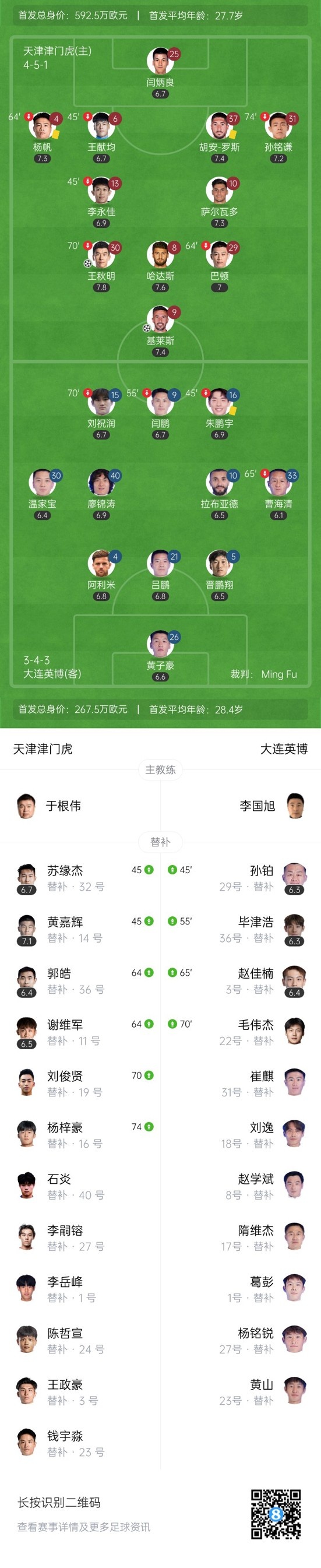下半场补时5分钟,天津津门虎2-0大连英博。