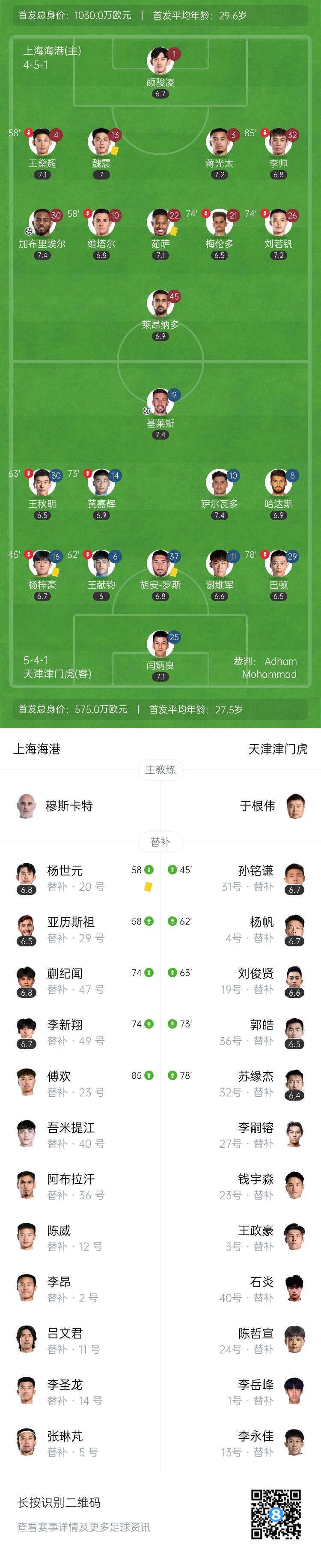全场比赛结束,最终上海海港1-1天津津门虎。