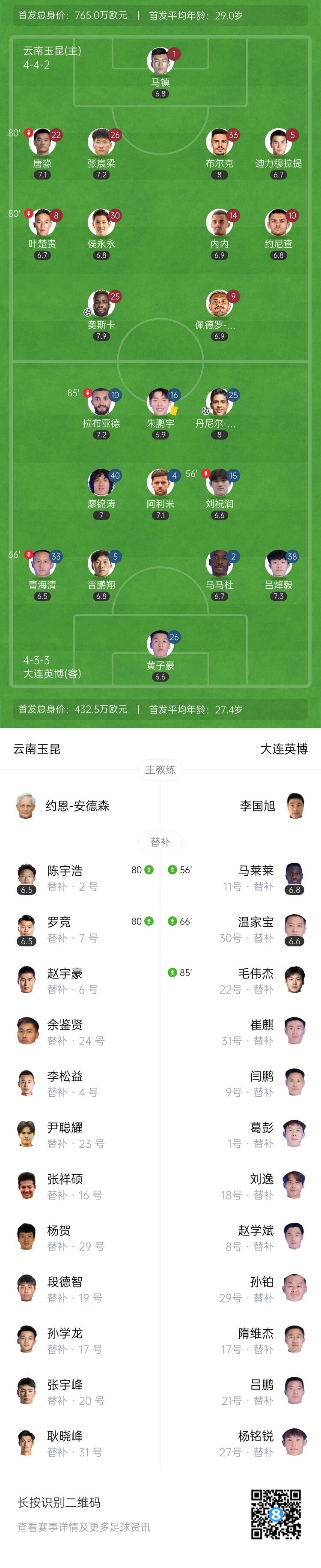 9月19日讯 北京时间9月19日晚上20:00,中超第25轮,云南玉昆坐镇玉溪高原体育运动中心体育场迎战大连英博。上半场,马镇失误送礼,佩尼亚笑纳。下半场,奥斯卡扳平,马镇扑单刀。全场比赛结束,云南玉昆1-1大连英博。本场过后,云南玉昆8胜7平10负积31分,排名中超积分榜第9;大连英博9胜6平9负积33分,排名中超积分榜第8。