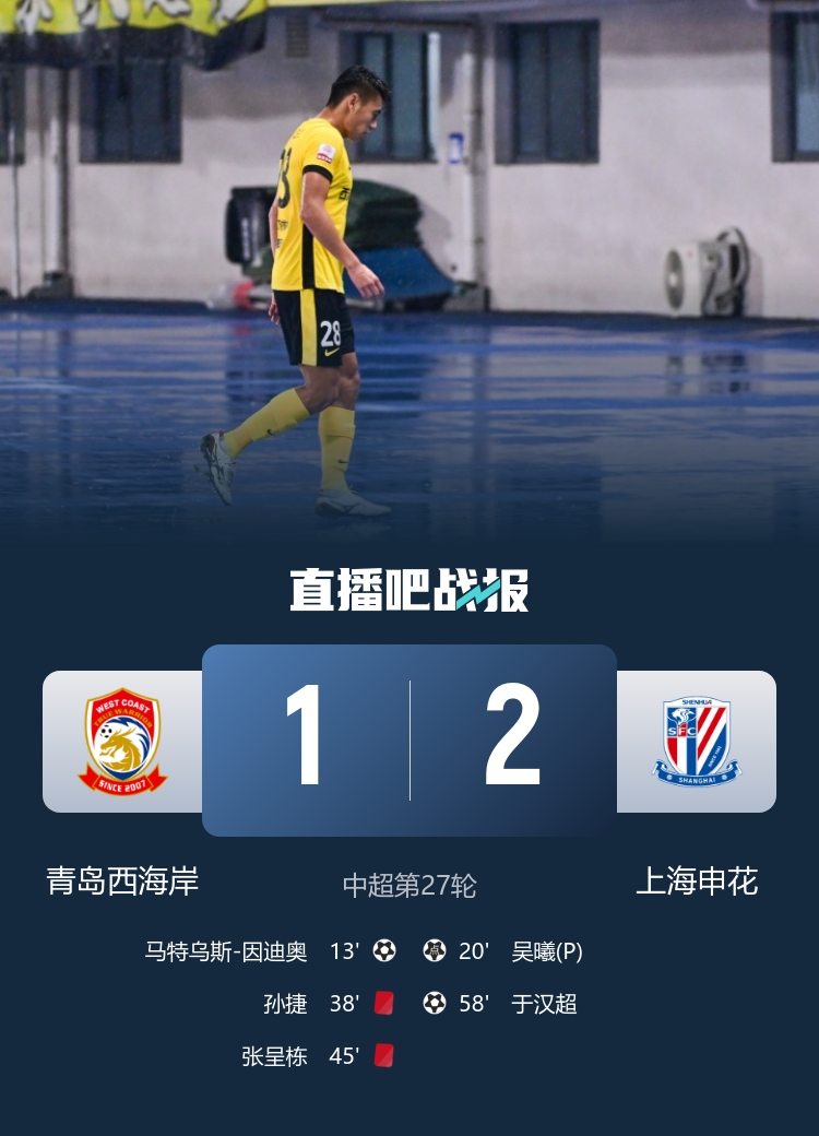 第20分钟,吴曦主罚点球破门,上海申花1-1扳平青岛西海岸↓