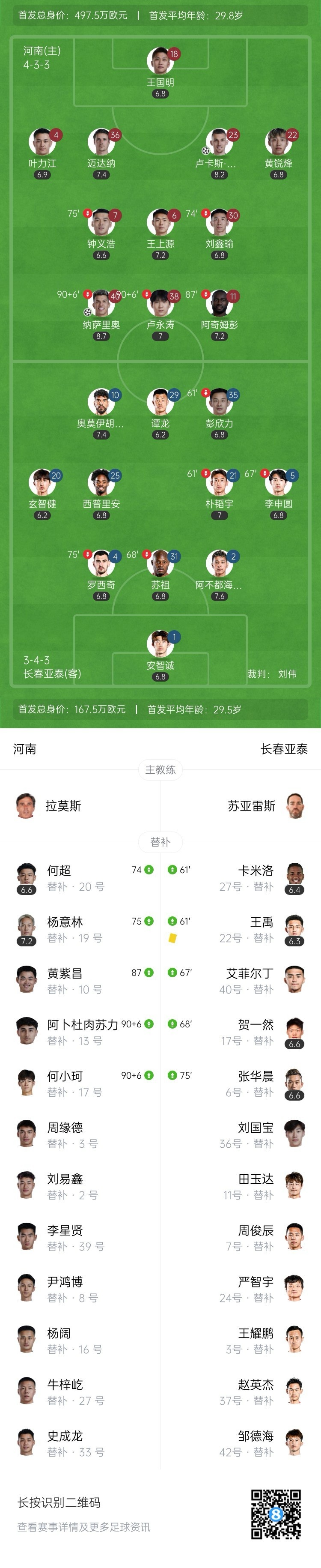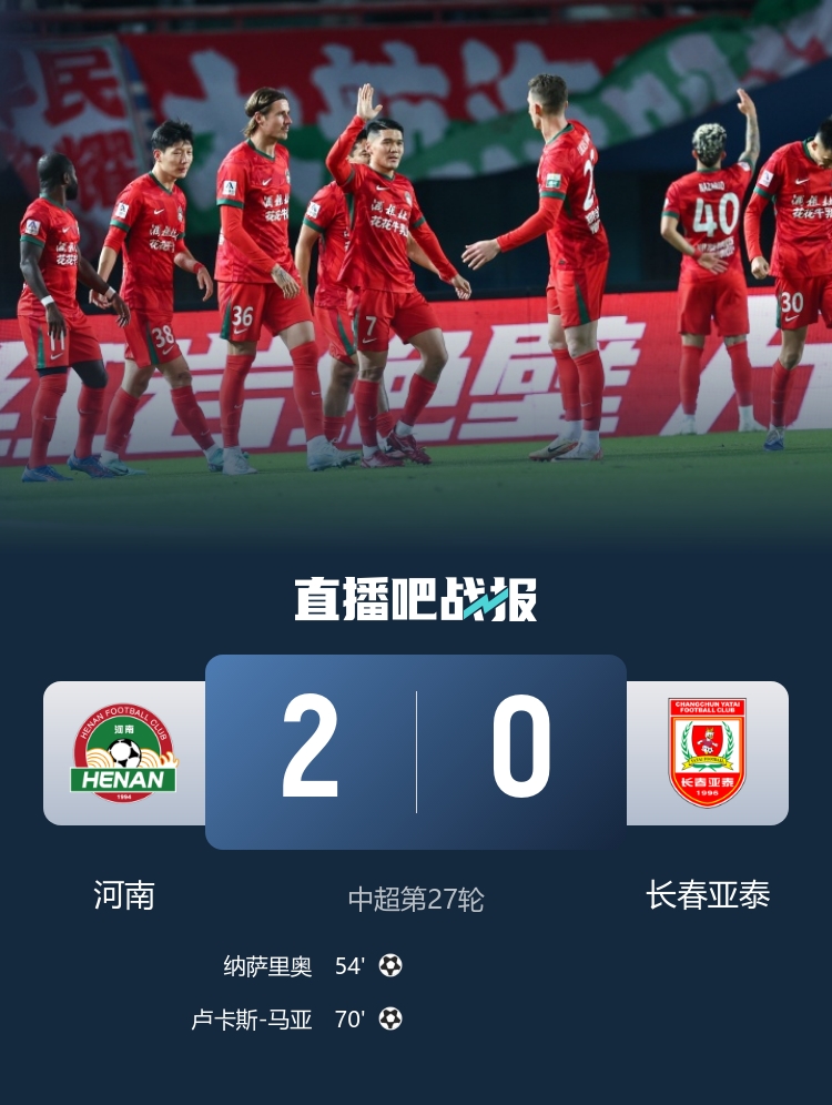 全场比赛结束,河南队2-0战胜长春亚泰。