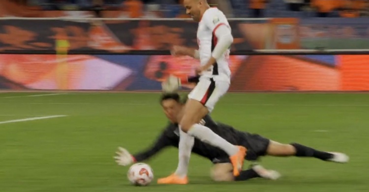 第28分钟,费利佩插上接队友直塞获得单刀机会,费利佩想要趟过王大雷时倒地,主裁判没有吹罚犯规。↓