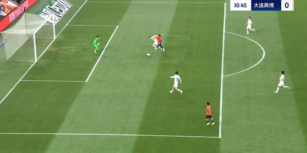 第32分钟,大连英博客场取得领先,拉布亚德左路角球开至后点被解围出禁区,吕焯毅停球之后起脚远射,皮球飞入远角,英博1-0领先青岛海牛。↓