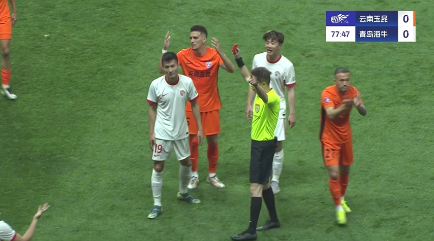 玉昆多打1人!宋文杰飞踹直红!第78分钟,宋文杰抬脚过高飞踹徐宏杰面部,通过VAR,裁判直接出示红牌罚下宋文杰!↓