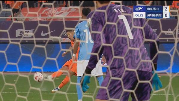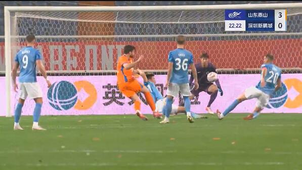 第30分钟,泰山队将优势扩大到4球,卡扎伊什维利抢断后脚底板向后拉球送出助攻,克雷桑远射破门,泰山队4-0领先新鹏城。↓