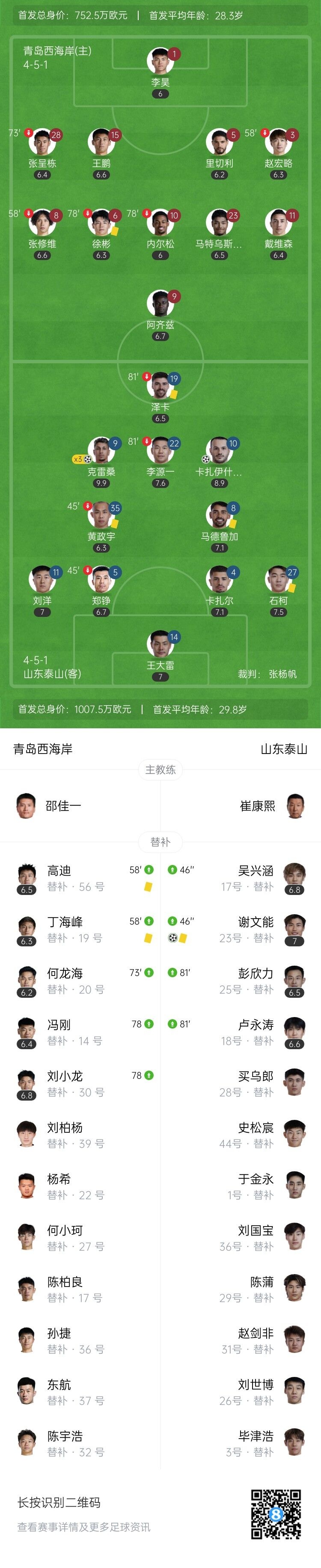 伤停补时8分钟。全场比赛结束,青岛西海岸1-5山东泰山。