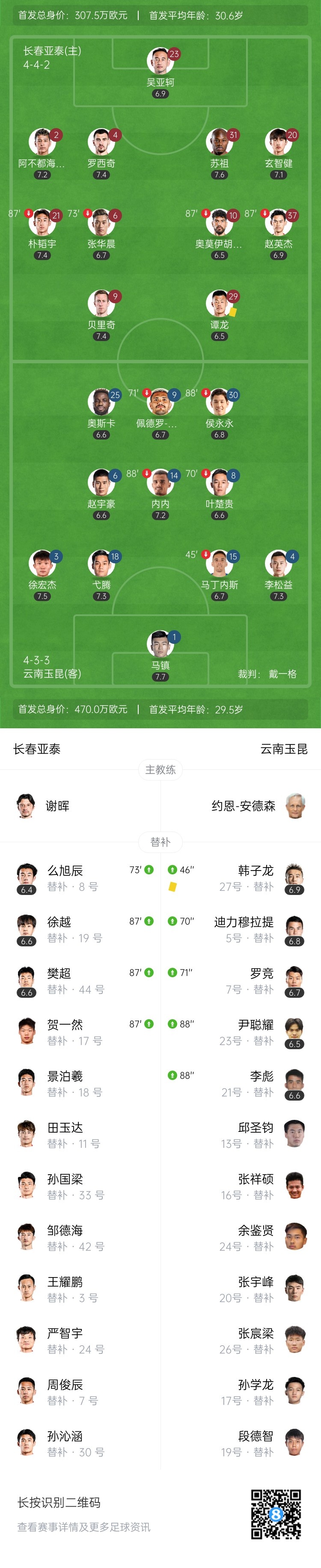 全场比赛结束,长春亚泰0-0云南玉昆。