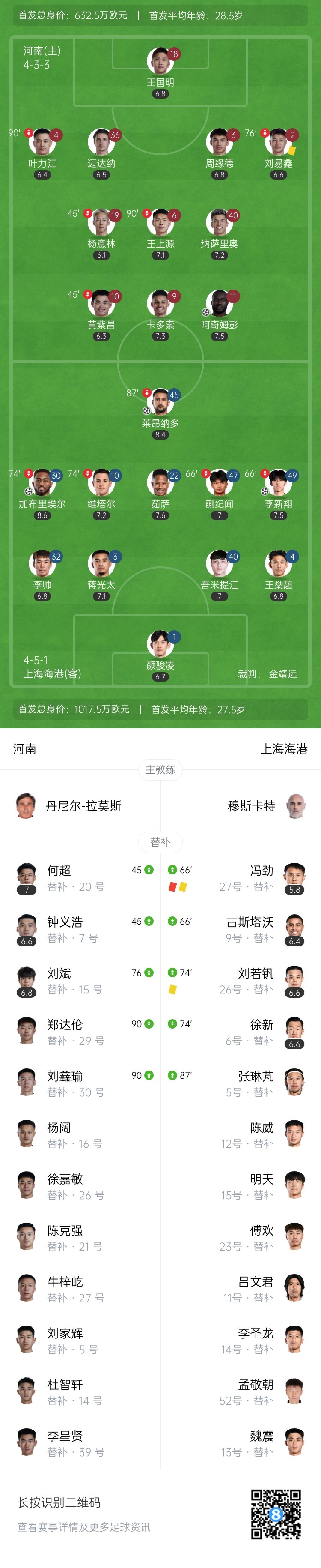 下半场伤停补时7分钟,全场比赛结束,最终上海海港3-1河南队。