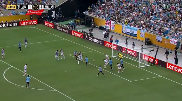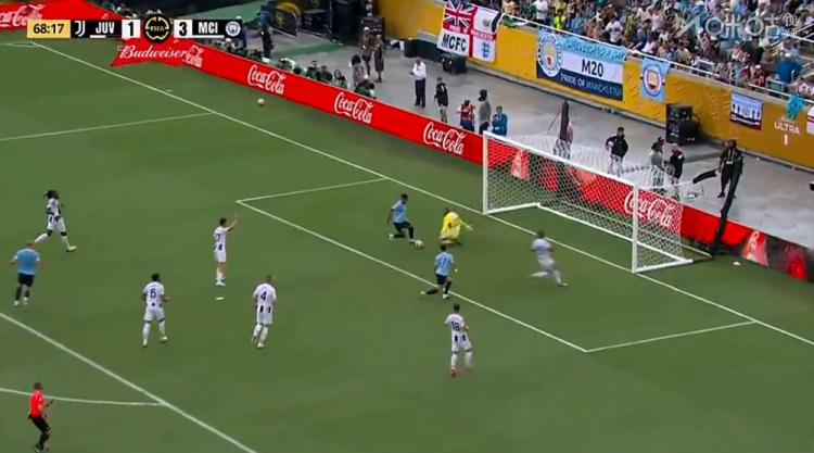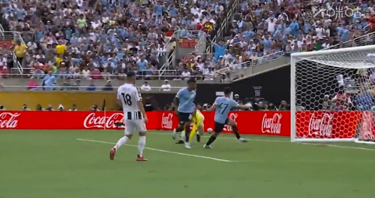 萨维尼奥世界波+传射!第76分钟,曼城的角球机会,哈兰德乱战中打门被迪格雷戈里奥挡出,萨维尼奥外围兜射直挂死角,尤文图斯1-5曼城!↓