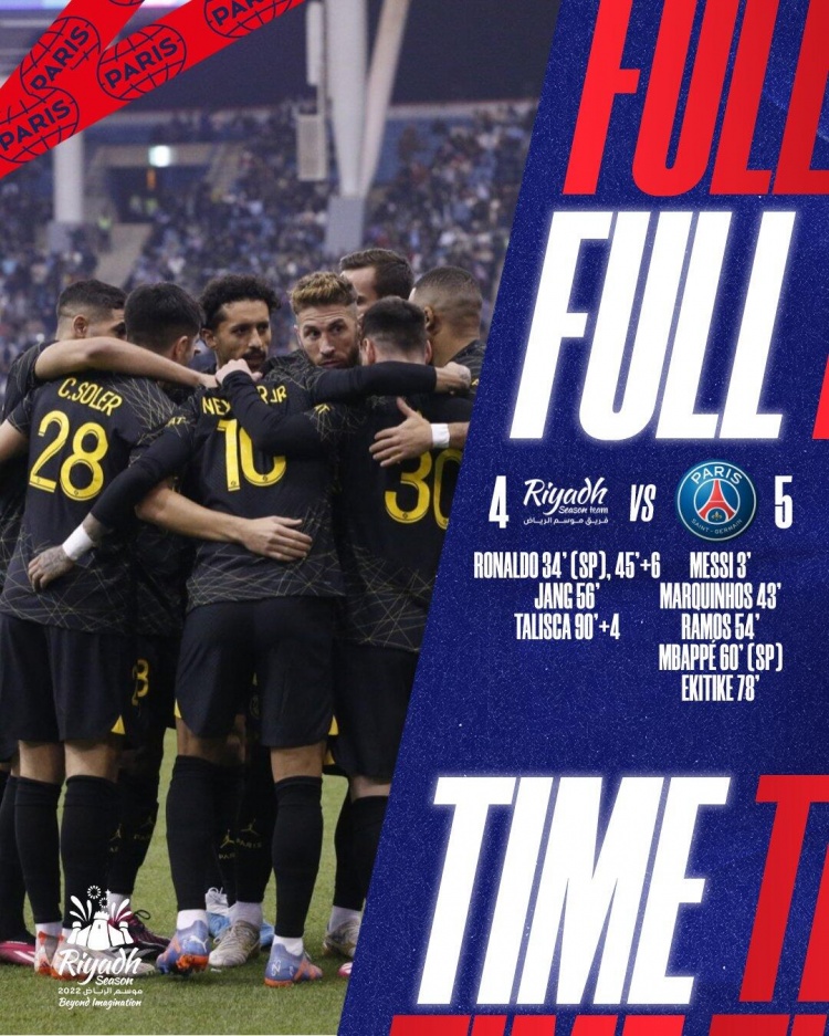 全场比赛结束,利雅得全明星队4-5巴黎圣日耳曼。