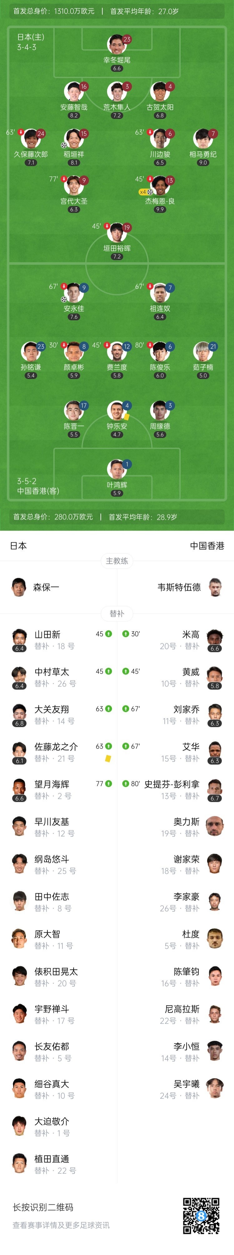 第10分钟,又是相马勇纪左路的传中,杰梅恩-良横向跑动中漂移头球破门,日本队2-0领先中国香港↓
