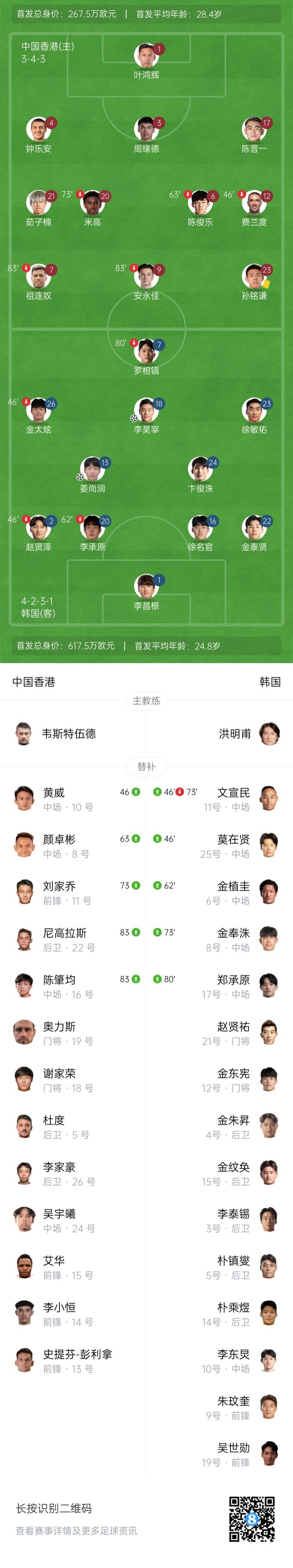 第66分钟,文宣民左路传中到后点,韩国高中锋李昊宰抢到后卫身前头球破门,韩国队2-0领先中国香港↓