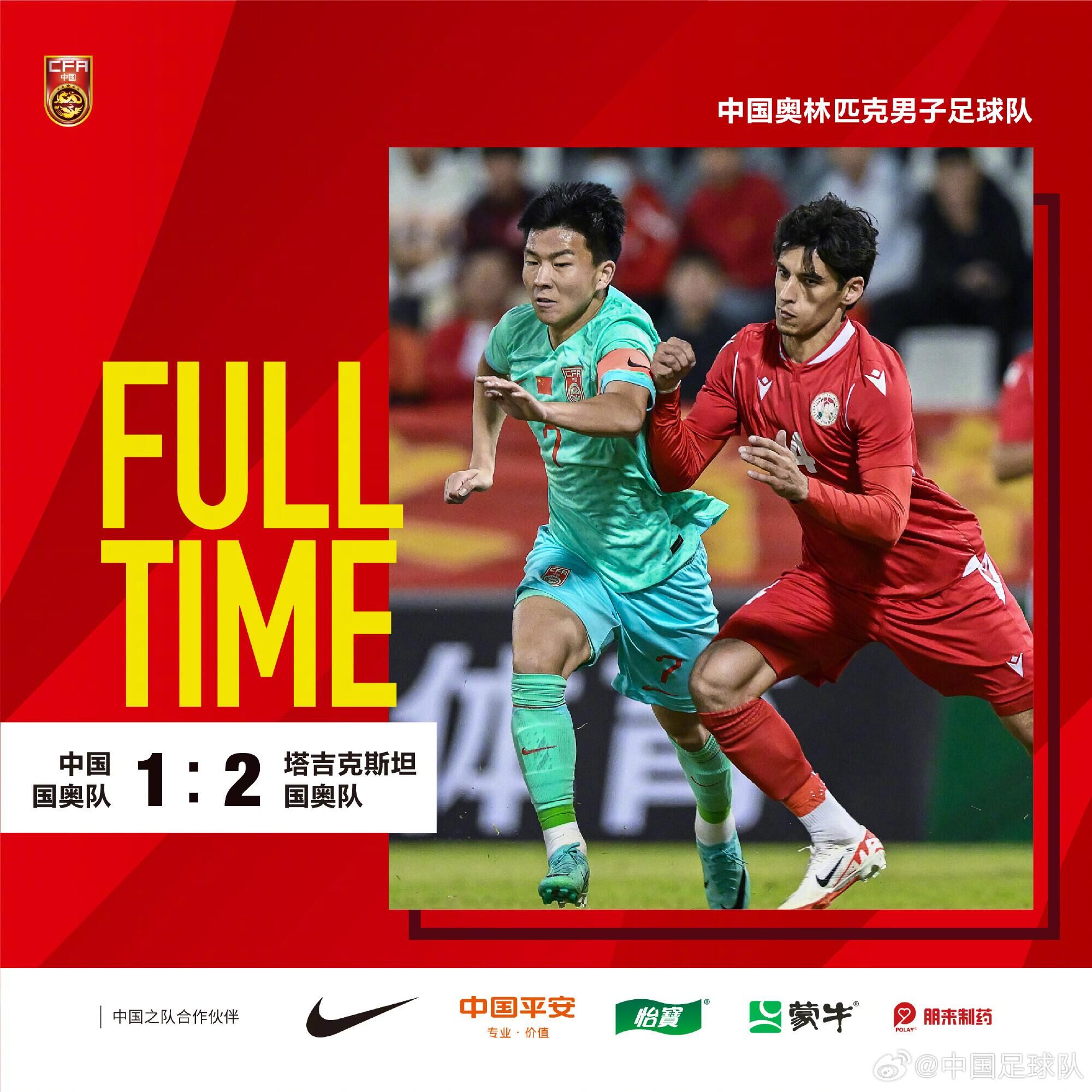 最终伤停补时结束,国奥1-2负于塔吉克斯坦国奥。