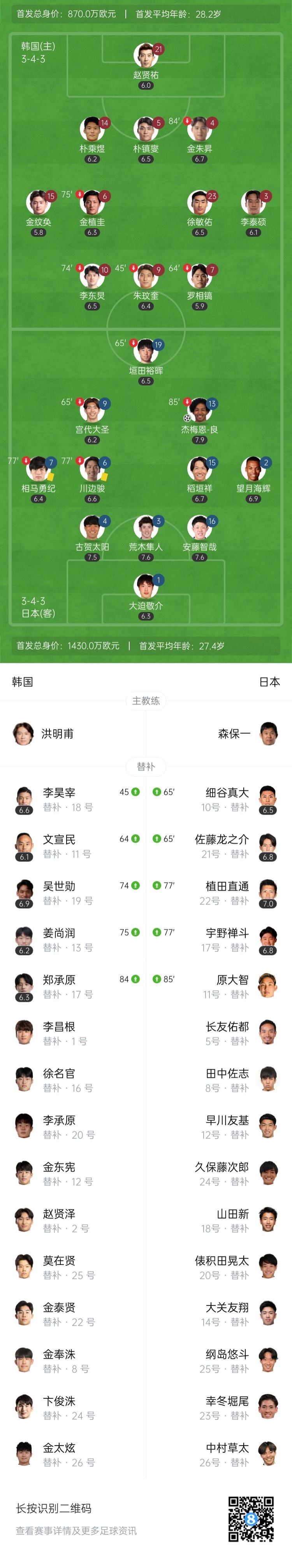 第8分钟,相马勇纪内切一步右脚兜进禁区,杰梅恩-良左脚直接凌空抽射攻破上角!日本1-0领先韩国↓