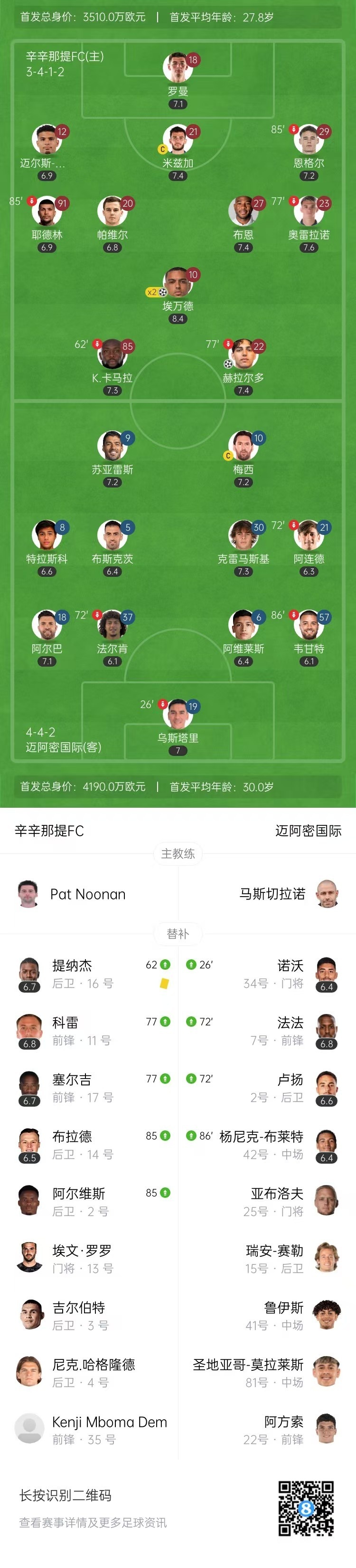 第70分钟,奥雷拉诺右路打门被门将扑出,埃万德门店补射完成双响,辛辛那提3-0迈阿密国际。↓
