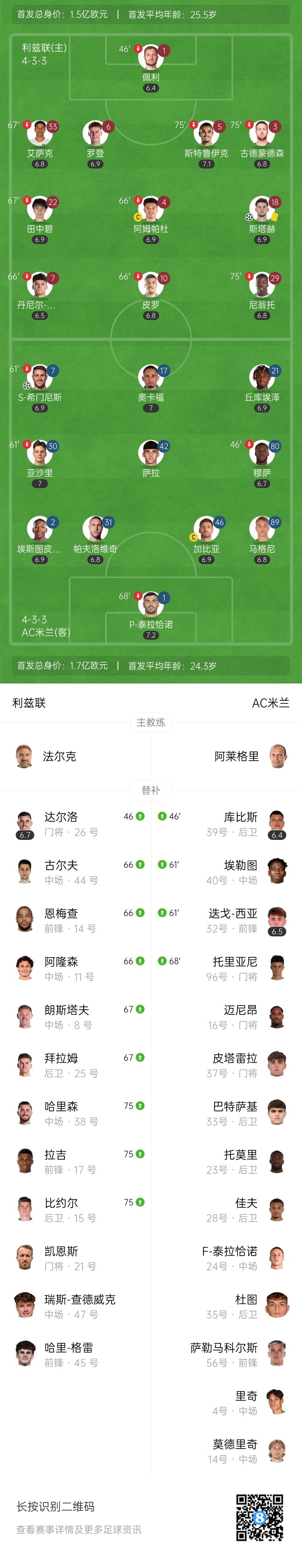 第67分钟,斯塔赫在禁区角上突然发难,右脚直接兜射打进球门右下死角!利兹联1-1扳平AC米兰↓