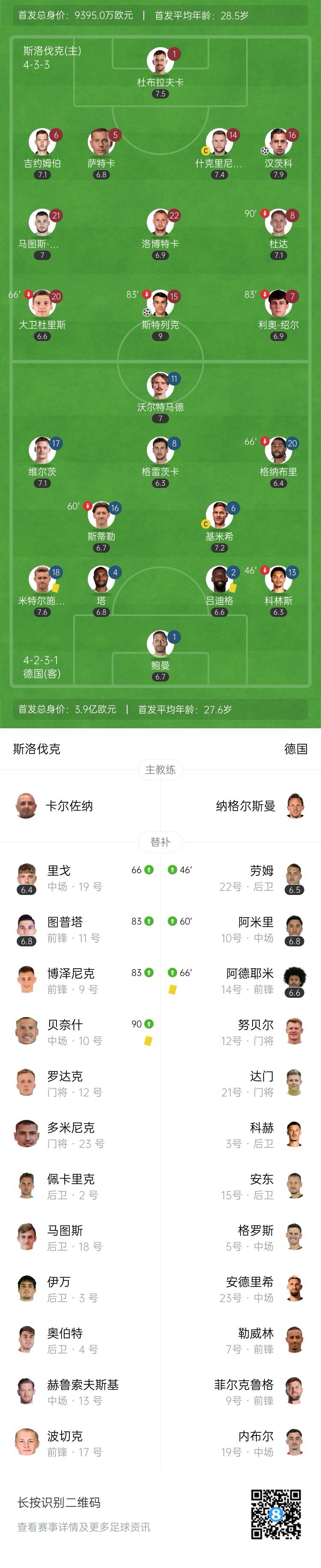 德国客场落后!第42分钟,德国后防盯人不紧,汉茨科直塞策动,斯特列克插上倒三角回敲,汉茨科自己跟进铲射得手,斯洛伐克1-0德国!↓