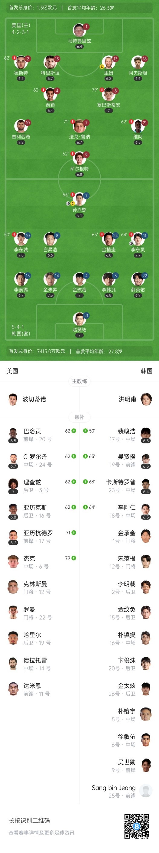 第42分钟,韩国再下一城!孙兴慜左路和李在城撞墙配合后到禁区横传门前李东炅后脚跟推射破门,美国0-2韩国。↓