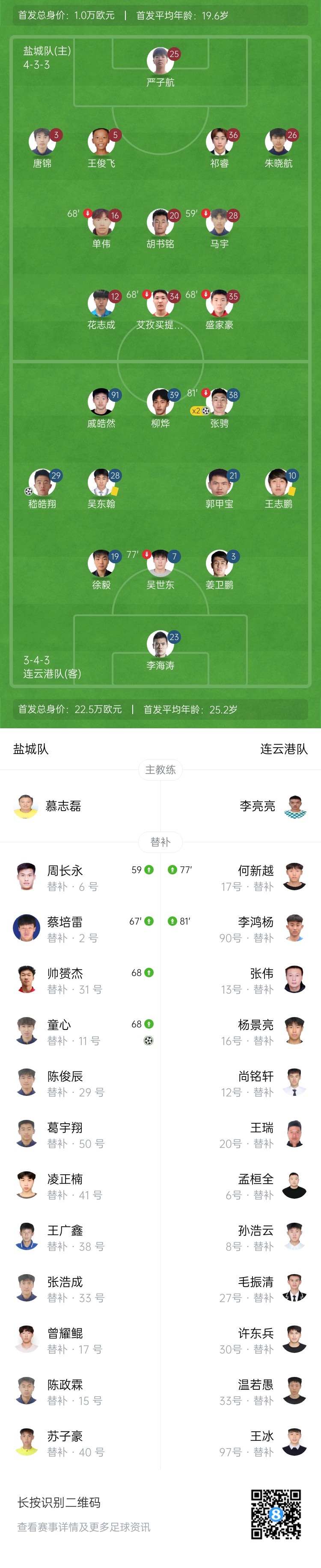 苏超-盐城主场1-3连云港 张骋双响嵇皓翔破门童心建功