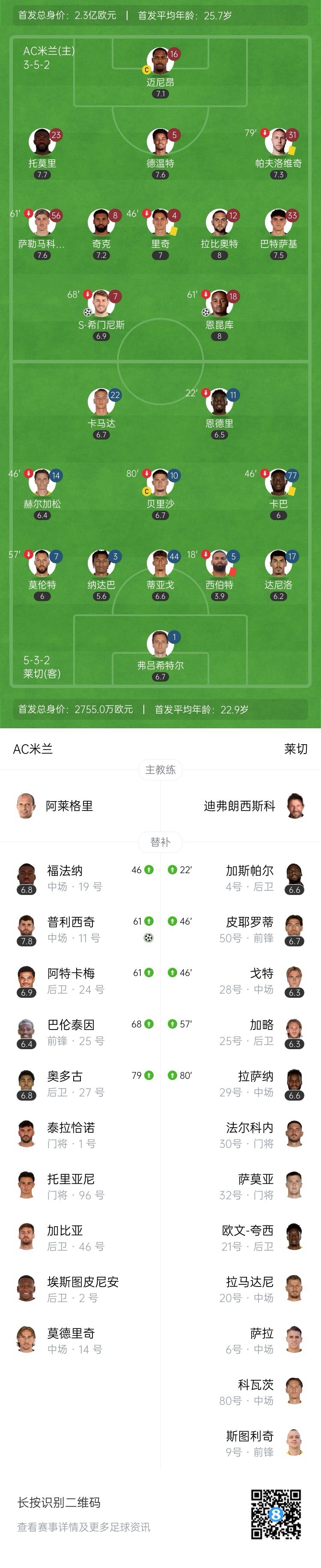 米兰3球领先!普利西奇连场破门+6场5球1助!第64分钟,奇克分球,福法纳右路传中,普利西奇包抄凌空垫射得手,AC米兰3-0莱切!↓