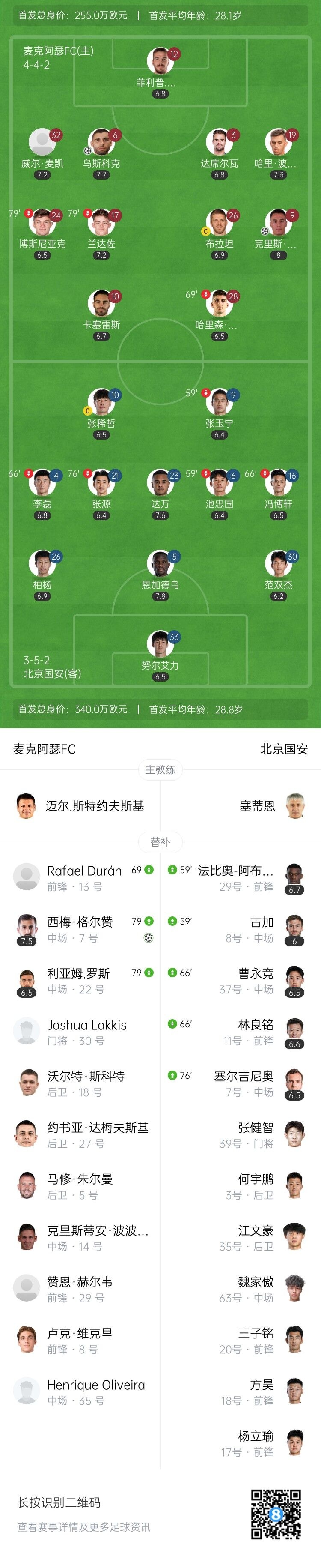 伤停补时3分钟。全场比赛结束,北京国安0-3麦克阿瑟FC。
