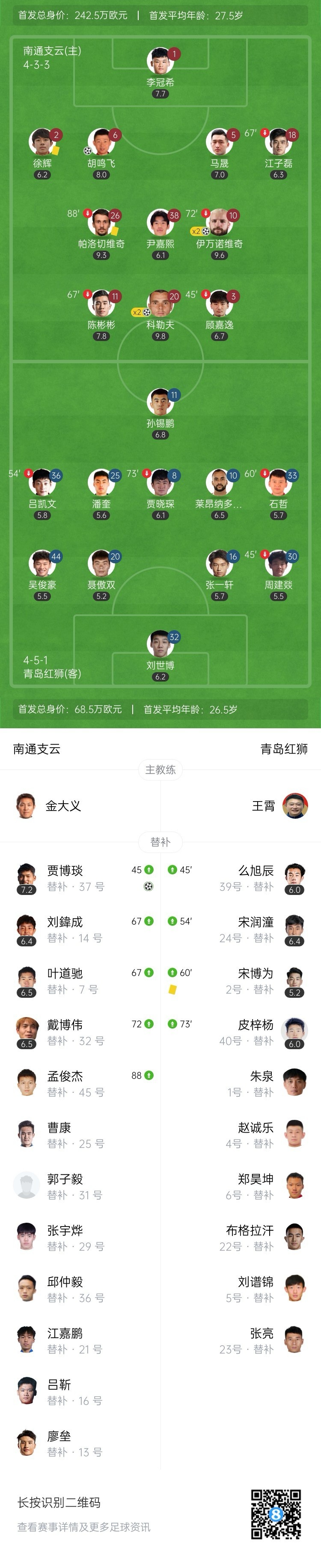 第13分钟,帕洛切维奇任意球开至禁区,胡鸣飞头球破门,南通支云1-0领先青岛红狮。↓