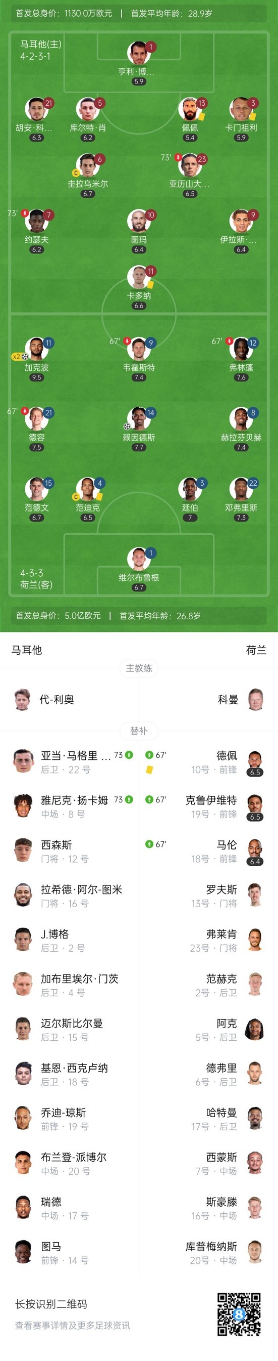 上半场补时5分钟,马耳他0-1荷兰。